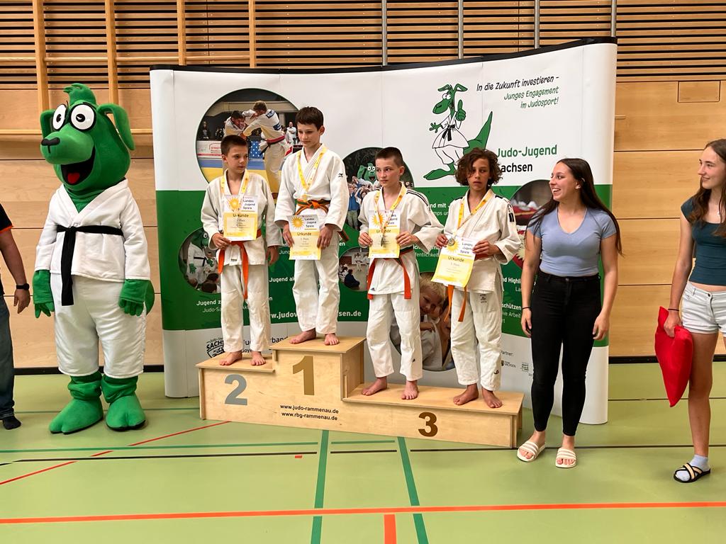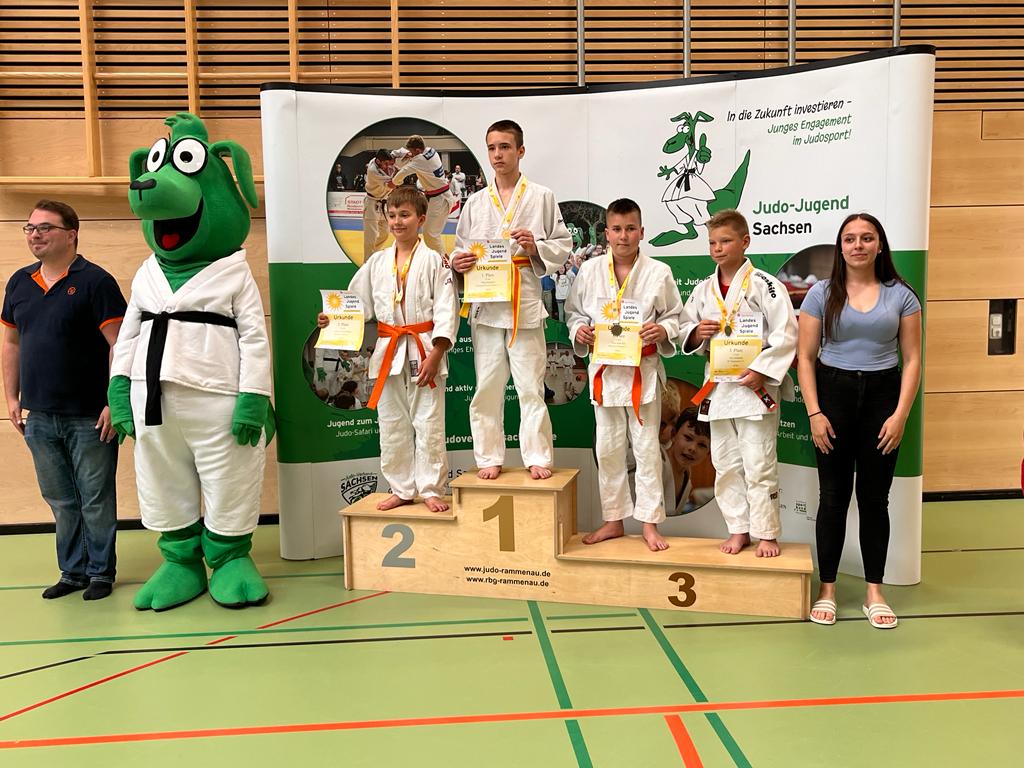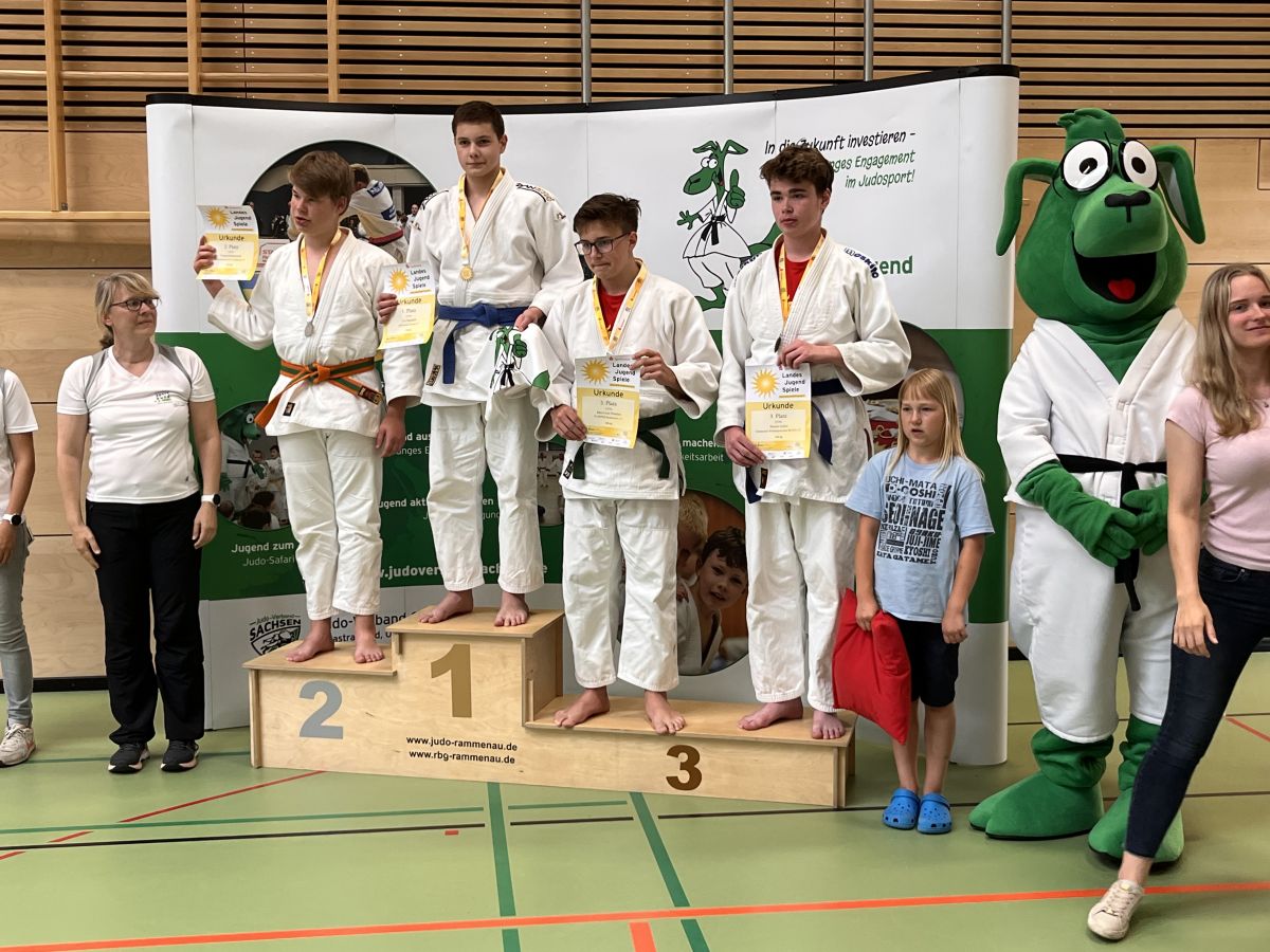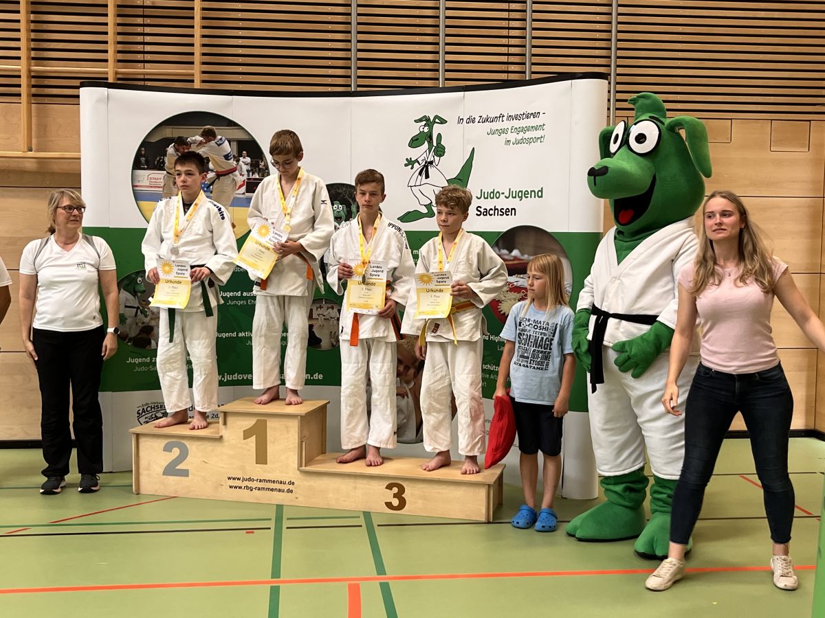 Unsere U13 männlich wurde erfolgreich vertretten durch Finn, Friedrich und Savelii. Am Nachmittag kämpfte Heidi-Maria in ihrer Alters- und Gewichtsklasse. Ihr Pool war mit 10 teilweise bekannten Teilnehmerinen besetzt. Mit drei erfolgreichen Kämpfen stand Heidi-Maria im verdienten Finale gegen die spätere Siegerin vom Judoclub Leipzig e.V. In der Bewertung des Wettkampfes kam es zur Hantei-Entscheidung. Nach dem Wettkampf gratulierten die Trainer vom Judoclub ebenfalls für die starke Leistung. Mit dem verdientem Silber und einem Foto mit dem Landestrainer Frederik Jäde konnte Heidi-Maria lächend nach Hause fahren. Nicht minder sind die Ergebnise von unseren drei männlichen Wettkämpfer zu sehen. Friedrich kämpfte sich in seiner mit 21 Teilnehmern besetzten Gruppe bis in das Halbfinale. Den dritten Platz erkämpfte er sich dann in der Hoffnungsrunde. Mit der Erfolgsgeschichte von Bezirkseinzelmeisterschaft, Sachsenmeisterschaft und den Landesjugendspielen kann er zum dritten Mal seinen Platz dominieren. Savelli war bei seinem dritten Wettkampf in der gleichen Gruppe wie Friedrich und konnte sich auf den neunten Platz vorkämpfen. Finn war in einer Gruppe mit 13 Teilnehmern angetretten. Seinen ersten Gegner vom JSV Rammenau sah er auf dem Treppchen wieder. Beide bekamen die Bronze für ihre starken Leistungen.