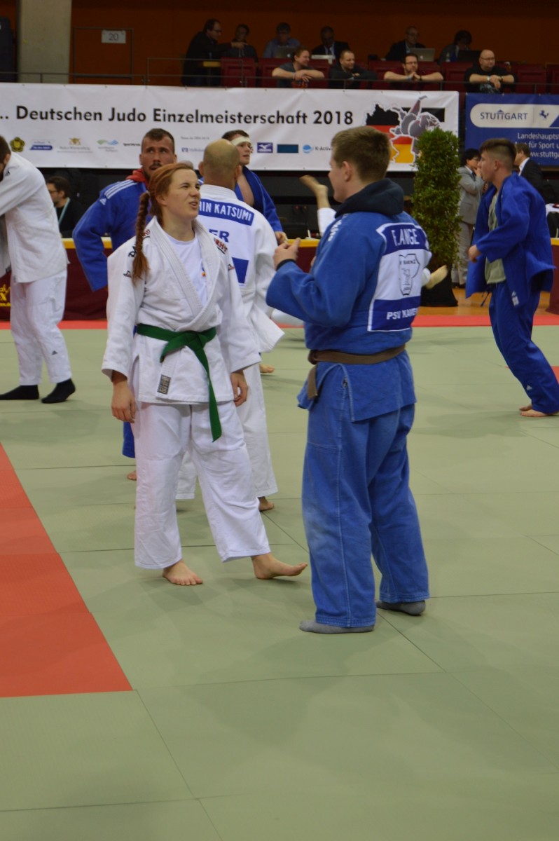 Am zweiten Kampftag war Luise dran (Foto oben bei der Erwärmung mit Fred Lange vom PSV Kamenz), die mit ihrem 5. Platz bei vergangenen Deutschen Meisterschaften bereits Erfahrung mit auf die Tatami nahm.