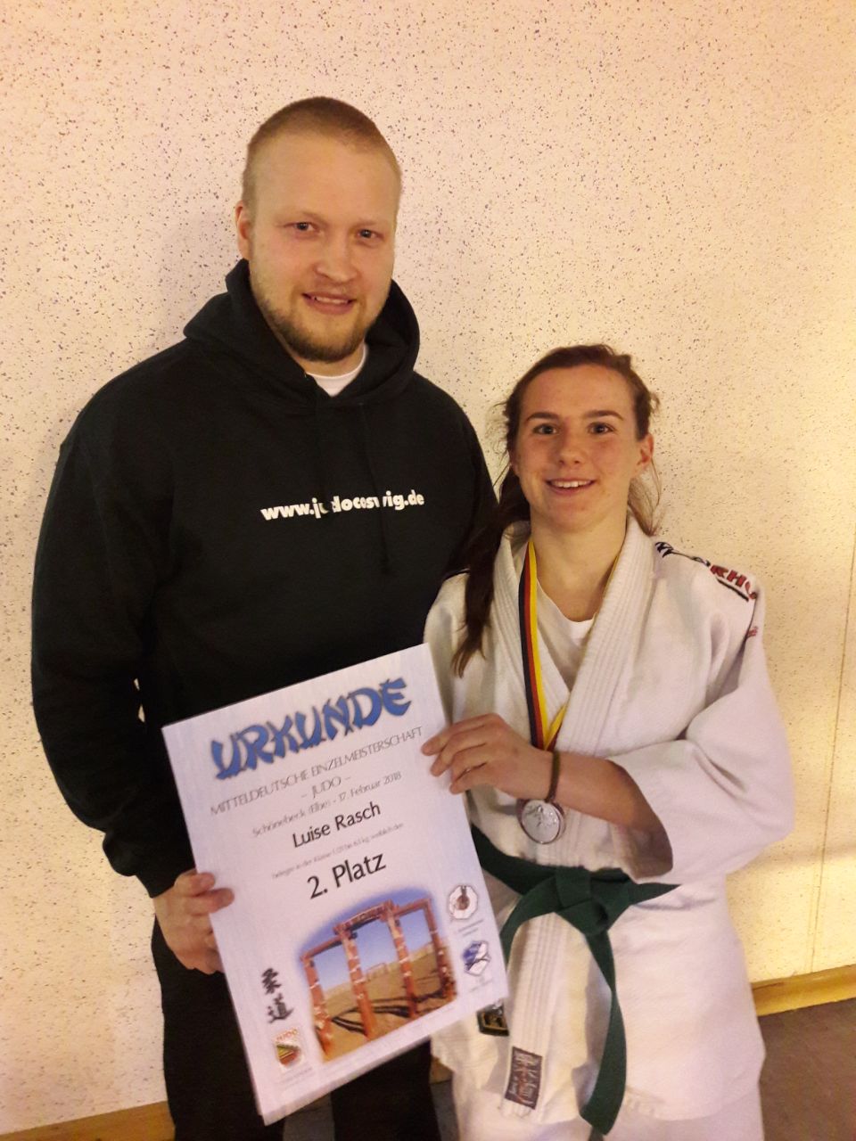 Nach der Qualifikation durch die Landesmeisterschaften ging es für Luise zu den Mitteldeutschen Meisterschaften mit einem Bus voll Fans nach Schönebeck. Nach den Kämpfen der U 18 starteten die Sportler der U 21 sehr spät in den Wettkampftag. Für Luise sollte das kein Problem sein. Im Gegensatz zu den Veranstaltern, die zwischendurch mit Stromausfall zu kämpfen hatten, fand Luise gut in die Kämpfe. Sie konnte sich mit fantastischen Leistungen bis ins Finale durchkämfen. Dort wartete die Kadersportlerin und Mitteldeutsche Meisterin von 2015 und 2017, Friederike Stolze, auf sie. Mit sensationeller Technik überrascht Luise ihre Gegnerin und geht mit Waza Ari in Führung. Nach starker Leistung geriet Luise allerdings in eine Würge, die sie leider abschlagen musste. Auf Grund ihrer starken Leistungen hat sich Luise diesen Vize-Meistertitel mehr als verdient.