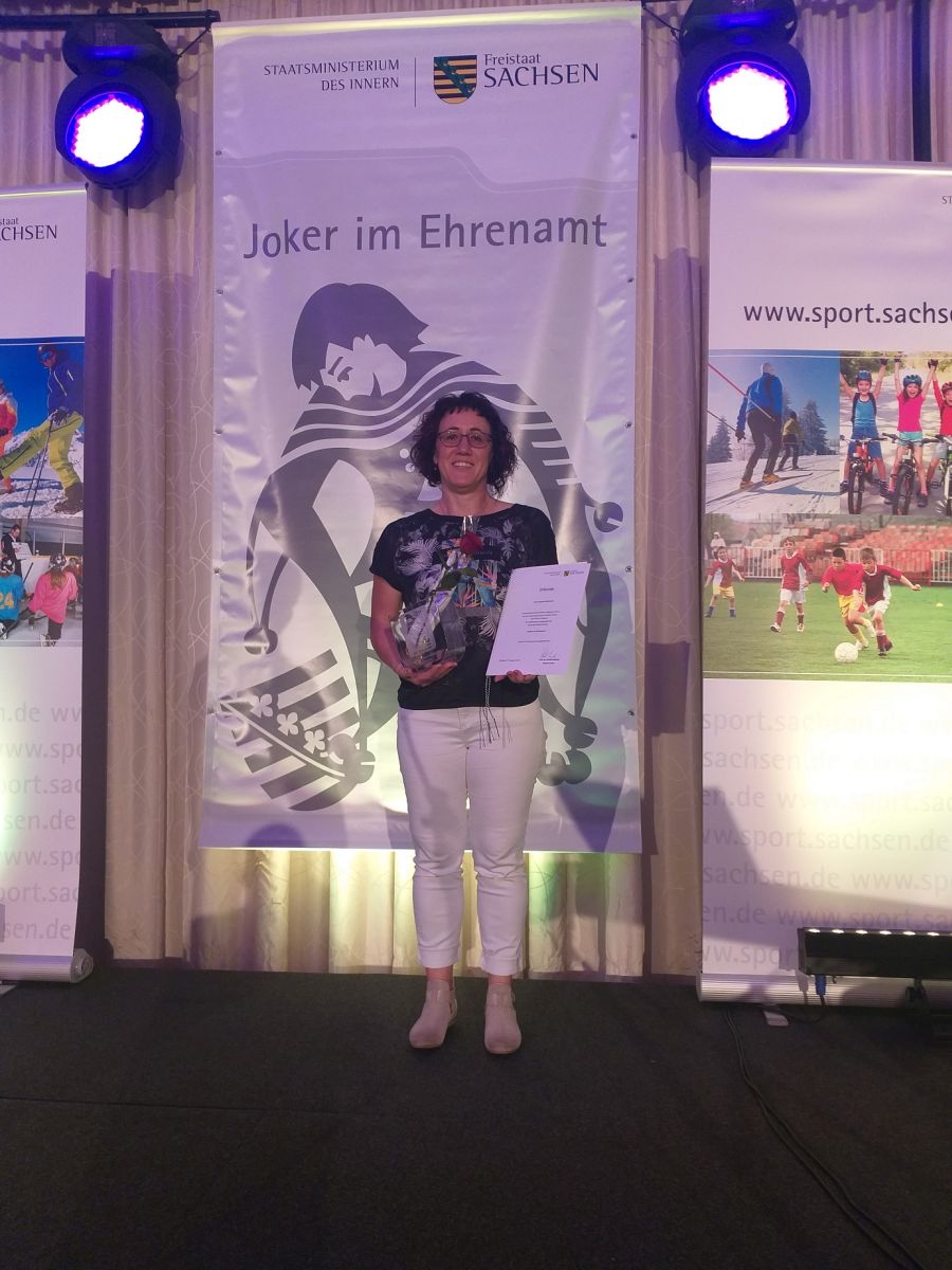 Zur 24. Verleihung des "Joker im Ehrenamt" am 23. August 2019 im Hilton Dresden war auch unsere Astrid eingeladen. 40 Ehrenamtliche Sachsens, darunter auch unsere Astrid, erhielten aus den Händen der Sozialministerin Barbara Klepsch in Vertretung des Sportministers Roland Wöller den Joker im Ehrenamt für ihre unermüdliche, zeitraubende ehrenamtliche Tätigkeit.