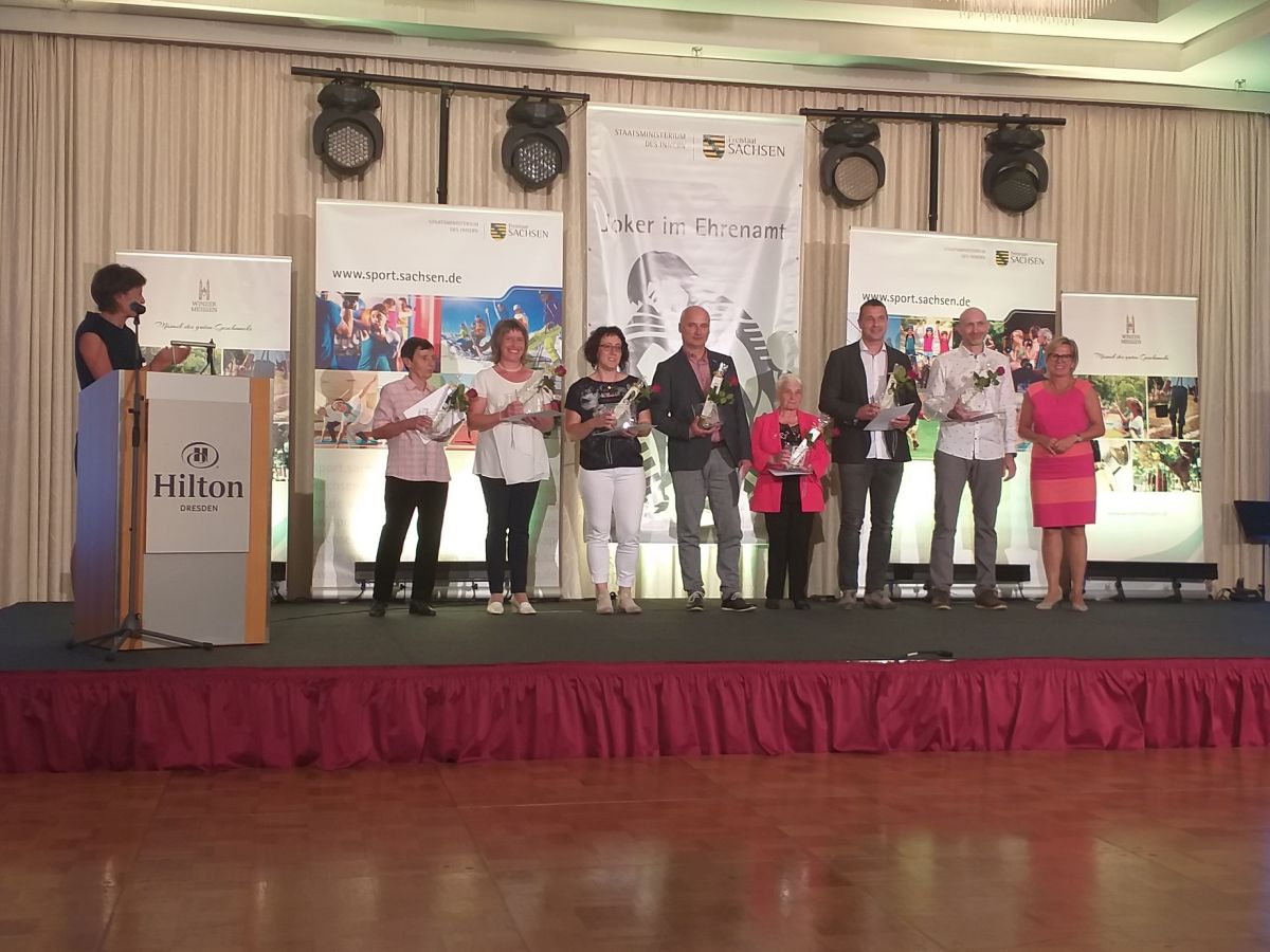 Zur 24. Verleihung des "Joker im Ehrenamt" am 23. August 2019 im Hilton Dresden war auch unsere Astrid eingeladen. 40 Ehrenamtliche Sachsens, darunter auch unsere Astrid, erhielten aus den Händen der Sozialministerin Barbara Klepsch in Vertretung des Sportministers Roland Wöller den Joker im Ehrenamt für ihre unermüdliche, zeitraubende ehrenamtliche Tätigkeit.