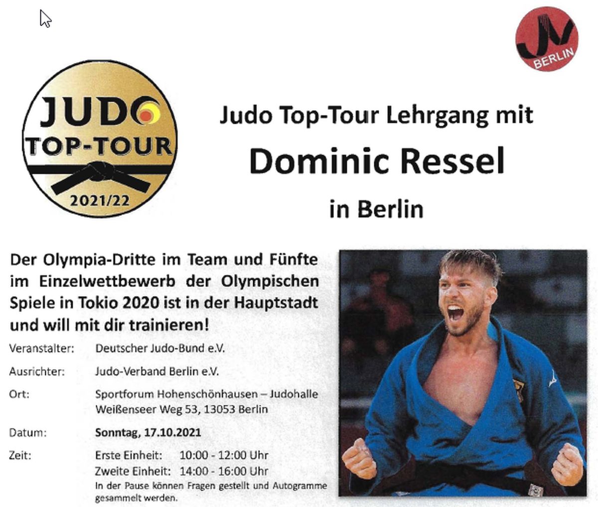 Am 17.10.2021 hatte der Judoverband Berlin zum Judo-Top-Tour Lehrgang mit Dominic Ressel geladen. Gabriel nahm diese Einladung ins Sportforum Hohenschönhausen an und konnte somit an zwei Trainingseinheiten mit dem Olympiastarter teilnehmen. Bei dem auf einem sehr hohen Niveau angelegten Training unter Leitung von Dominic Ressel wurden Stand- und Bodentechniken trainiert und anschließend im Randori gefestigt. Es war ein wunderbarer Tag mit vielen Erkenntnissen und Herausforderungen.